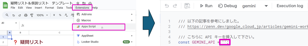 いずれ Google Sheet などに標準搭載されそうな機能ですが、今回は Google Apps Script を使って関数を作っています。利用時には App Script の編集画面を開き、API キーを取得して挿入してください。(参考)